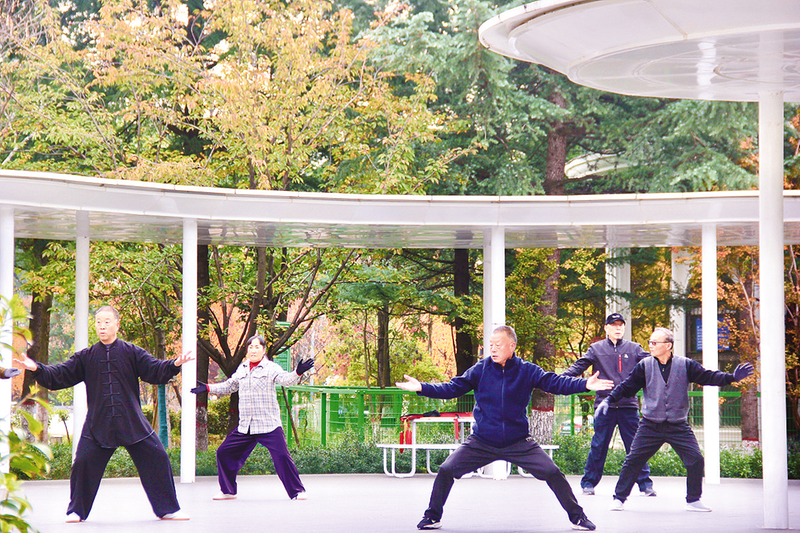 随着拉伸的结束,音乐起,殷鉴和老友们迅速调整站姿:双脚与肩同宽,膝盖微屈,双手垂于体侧,眼神渐趋专注。练太极10年时间里,他每日坚持,动作早已熟稔,抬手、转身都与音乐节奏契合,额头很快渗出汗珠,在晨光中闪着微光。