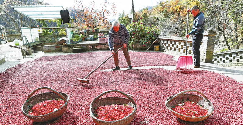 近期,正是山茱萸成熟季节,火红的果实像一颗颗红玛瑙镶满了流岭山间。丹凤县峦庄、寺坪、土门等镇的群众都在忙着采摘山茱萸。据了解,丹凤县山茱萸种植面积12万亩,年产量2000吨、产值1亿元,让1.2万户群众受益。图为11月9日龙驹寨街道群众在晾晒山茱萸。 (本报通讯员 阮世喜 摄)