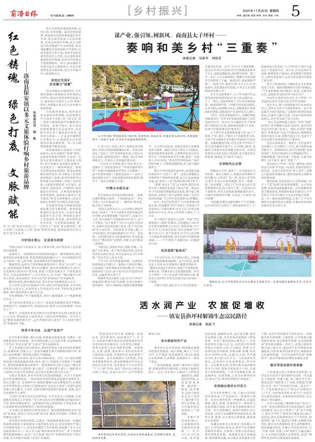 傍晚时分,太子坪村村民在文化大舞台上排练节目。红黄戏服伴着锣鼓声声,尽显乡土活力。11月10日,虽进入初冬,商南县金丝峡镇太子坪村依然涌动着蓬勃生机。农家乐厨房里,“金丝十三花”的香味直往鼻子里钻;民宿小院里,游客的说笑声一阵接一阵;冷水鱼基地边上,钓鱼的人悠闲地盯着水面。