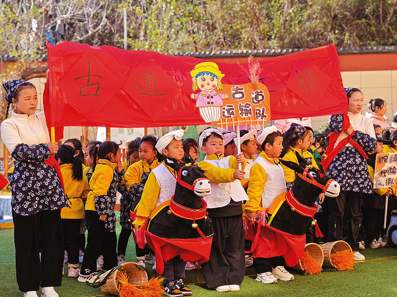 近日,丹凤县第九幼儿园举办主题运动会,以“商山果缤纷”“丹水鱼米香”“古道丰收情”三大特色板块,生动展现丹凤本土文化魅力,让孩子们在趣味运动中体验秋收冬藏的喜悦,锻炼体魄,感受家乡风物之美。 (本报通讯员 周丽花 摄)
