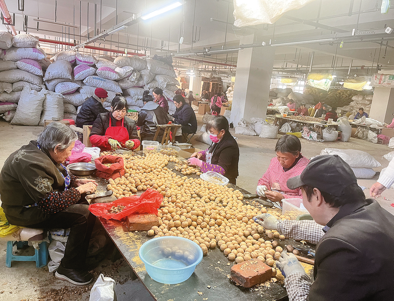 连日来,在丹凤县竹林关镇江北产业园内,近100名搬迁群众在核桃代加工点务工,每日收入30元至60元不等,真正实现了楼上居住,楼下就业。每年秋冬季,竹林关镇核桃代加工点工期持续4个月,可带动600多名群众就业,实现人均收入4000元。图为11月20日,丹水社区搬迁居民在江北产业园内务工。 (本报通讯员 王 蒙 摄)