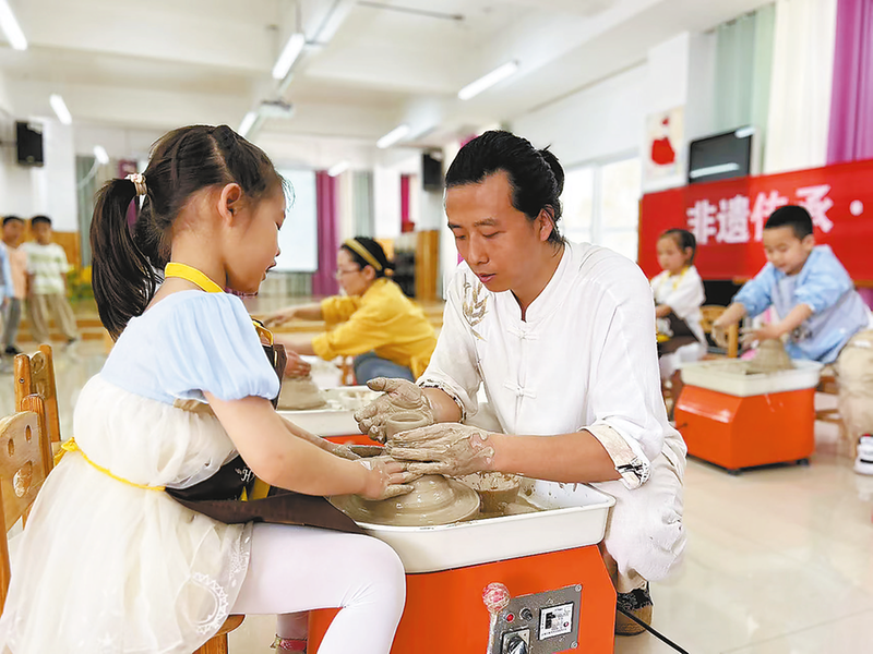 “非遗进校园”活动中,黄冲在镇安县第二幼儿园带领小朋友体验陶艺制作。(资料照片)本报记者 孙远飞