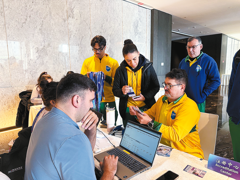 12月3日,U15世界中学生排球锦标赛报到现场,来自全球18个国家及地区的参赛队伍陆续抵达报到处,现场秩序井然、活力满满。图为巴西队队员正在工作人员指引下,有序办理报到手续、领取参赛证件。(本报记者 谢 非 摄)