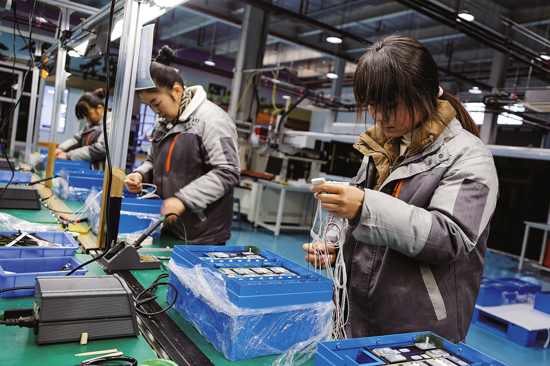 陕西优能美特科技有限公司主要经营储能、户外电源、光伏发电项目、电动汽车、观光车、公安巡逻车、电动自行车、滑板车等锂电池电池组PACK的生产、加工及销售。该公司位于商州区电子产业园3号标准化厂房,现有四条PACK生产线,年生产约8万度电PACK厂的产能,带动150人就业,促进周边经济社会长足发展。图为12月4日,工作人员为电池组安装线束。 (本报记者 王孝竹 摄)