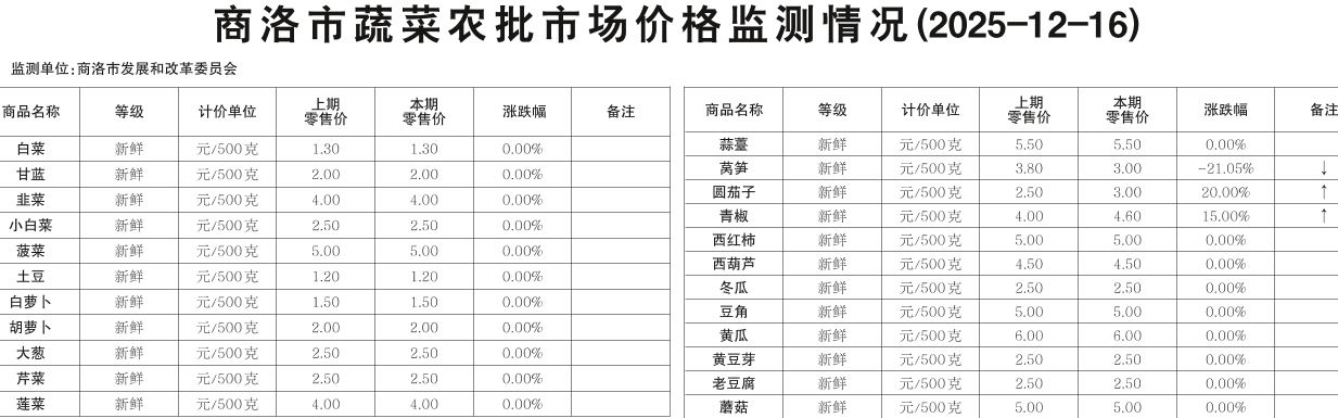 商洛市蔬菜农批市场价格监测情况(2025-12-16)