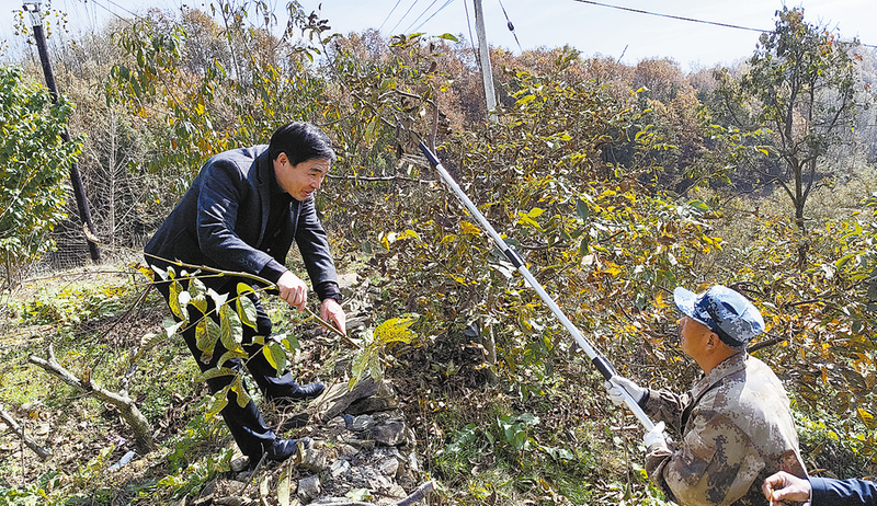 近日,李德俊(左)与山西核桃科管师傅在种植基地交流秋冬季核桃修剪技术。他响应国家脱贫攻坚号召,回乡在贫瘠的土地上辛勤耕耘,将一片荒山秃岭变成群众致富的“绿色银行”,在大山深处用青春和智慧谱写了为民新篇章。他就是丹凤县武关镇阳阴村回乡创业带头人、商洛鑫盛阳生态种养殖专业合作社负责人李德俊。