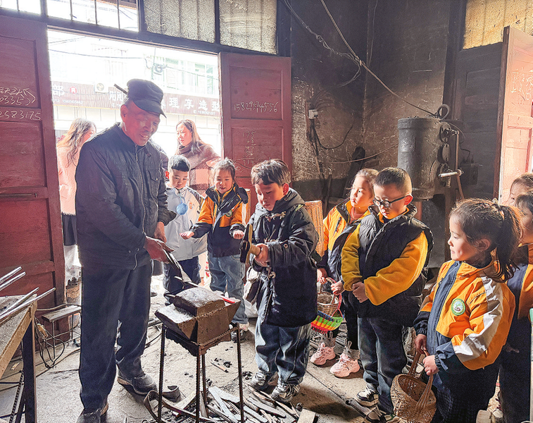 近日,丹凤县第九幼儿园的小朋友走进商镇的一家老式铁匠铺,近距离感受打铁这门传统手艺的魅力。这场特别的参观,让孩子们直观体会到“千锤百炼出精品”的匠人精神,也让传统手艺的种子在幼小的心灵里扎下了根。 (本报通讯员 赵 洁 摄)