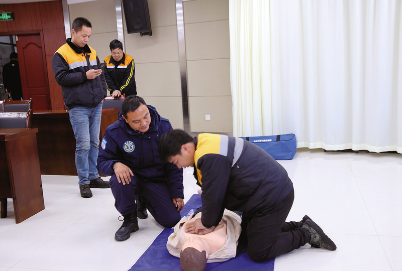 12月17日,商洛高新区邀请市红十字会为园区工作人员开展心肺复苏、自动体外除颤器(AED)使用及气道异物梗阻急救培训。图为工作人员现场演示心肺复苏操作要领,指导学员实操练习。(本报记者 耿 锟 摄)
