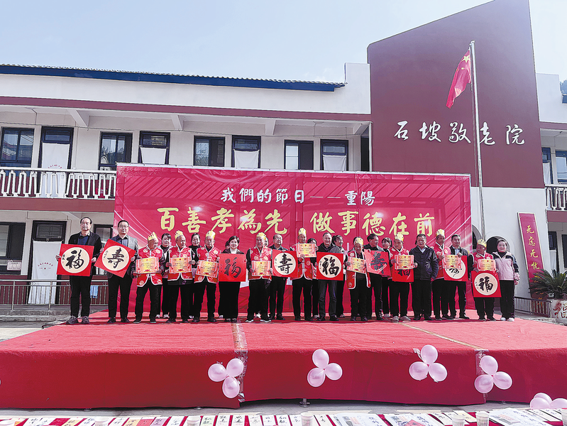 10月24日,石坡敬老院举行“百善孝为先·做事德在前”实践活动。图为敬老院为老人送“福”“寿”。