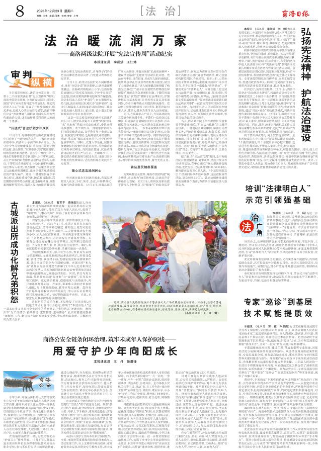 为实现普法全覆盖,商洛市法院构建“城乡联动、多点发力”的宣传格局,让法治声音传遍街头巷尾。12月3日,商州区高新法庭干警深入乡村社区,用“接地气”的家常话普及法律常识;同时还为商州区农村信用合作联社高新区信用社开展专项普法,助力金融机构防范风险、合规经营。12月4日,山阳县法院干警兵分多路,走进城区政府广场乡村集市,在冬日寒风中搭建起“普法驿站”。干警们化身“普法贴心人”,向群众递上宪法读本与法律手册,围绕婚姻家庭、邻里纠纷、养老诈骗等热点问题以案释法,让抽象的法律条文变得通俗易懂。“原来宪法还能帮我们解决这些家常事!”一位咨询完邻里纠纷的大爷连连点赞。与此同时,各人民法庭同步在辖区开展宣传,活动累计发放资料300多份,解答咨询20多人次,实现城乡普法全覆盖,彰显司法为民的责任担当。