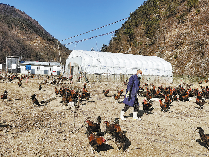 12月23日,山阳县两岭镇上坪村生态养殖产业园里,饲养员正在给散养香鸡投食。在帮扶单位秦始皇帝陵博物院援建下,上坪村投资45万元建成集养殖、屠宰、包装于一体的产业园,每年散养土鸡2000只,村集体经济年增收6万多元,带动群众务工50多人,人均增收3000元。 (本报记者 马泽平 摄)