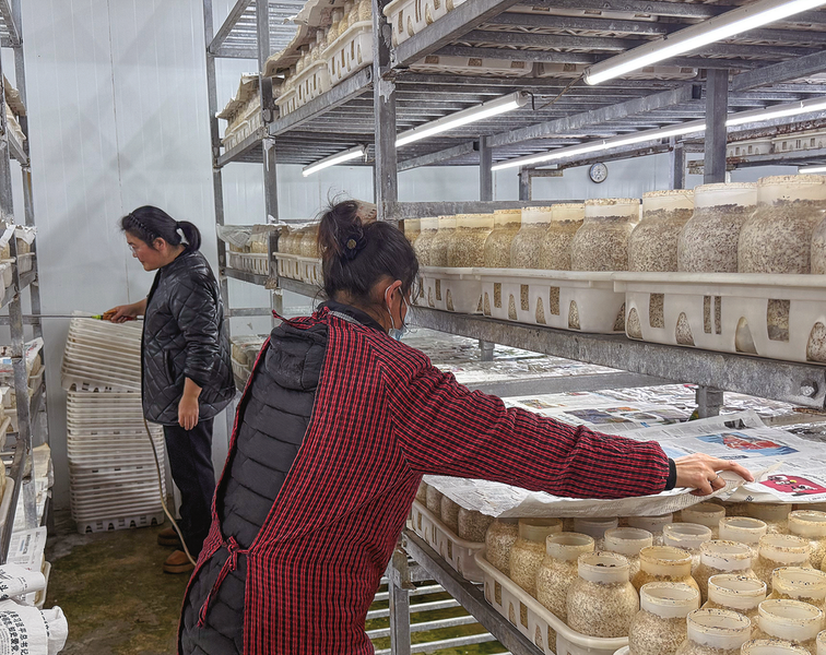 12月29日,在位于商州区夜村镇杨塬村的陕西天吉龙生物科技有限公司的生产车间,工作人员正在为春节期间上市的白灵菇菌瓶喷洒保湿。据悉,该企业年产白灵菇800多吨,产品主要销往北京、上海、广州、深圳等地,带动周边40多名群众就业增收。 (记者 王孝竹 摄)