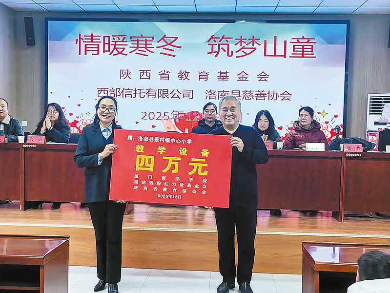 2025年12月30日,陕西省教育基金会携手西部信托有限公司、洛南县慈善协会,走进景村镇中心小学,开展爱心捐赠活动,为该校20名家庭困难、品学兼优学生每人发放1000元助学金,并向该校捐赠了价值4万元的教学设备,以实际行动传递社会关爱。(本报通讯员 郭夏季 摄)