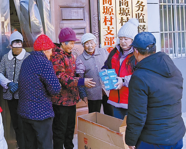 1月7日,商州周末微公益协会携手广西双蚁药业有限公司、西安市助老爱幼公益慈善基金会,走进商州区牧护关镇大商塬村,开展慈善捐赠活动。 (本报记者 方 方 摄)