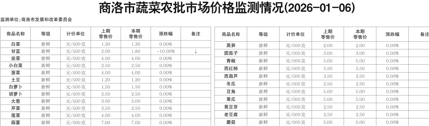 商洛市蔬菜农批市场价格监测情况(2026-01-06)
