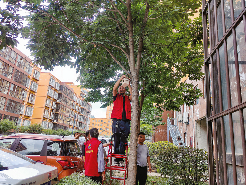 日子好起来的刘锋(中),经常积极参与社区公益活动。图为他参与社区护鸟行动。本报记者 张 英
