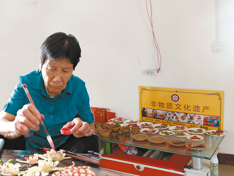康明娥拿着毛笔,小心翼翼地给做好的面花上色。