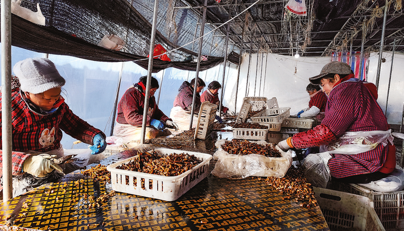 1月9日,康乐村滑子菇种植基地里,务工群众对新采摘的滑子菇进行剪根作业。隆冬的秦岭山区,寒意袭人。1月9日,走进山阳县户家塬镇康乐村的滑子菇种植基地,却是另一番景象:整齐排列的53座大棚内,湿润温暖,菌香弥漫。来自康乐村及周边村庄的数十名务工群众正穿梭其间,手脚麻利地采摘着一簇簇色泽金黄、表面覆着晶莹黏液的滑子菇。欢声笑语伴随着忙碌的身影,驱散了冬日的清冷,绘就了一幅热火朝天的乡村产业振兴图景。
