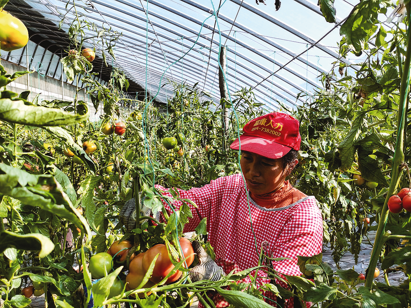 1月7日,在陶岭社区温室大棚内,工人在采摘成熟的西红柿。1月7日,一场大雪初霁,洛南县城关街道陶岭社区的田野银装素裹,一排排温室大棚静静伫立。棚外积雪未消,棚内却温暖如春。掀开厚重的门帘,融融暖意裹挟着泥土的芬芳与果蔬的清新扑面而来。绿意盎然的藤蔓沿支架舒展攀爬,一串串西红柿宛如红宝石般垂挂枝头,果实圆润饱满,色泽鲜亮诱人。