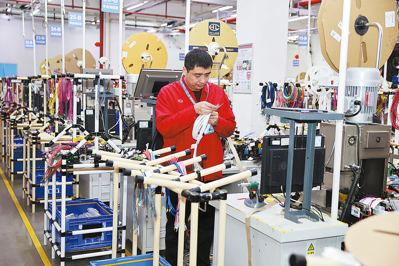 1月16日,在商洛比亚迪实业有限公司线束工厂车间,工人正在生产线上忙碌作业。该线束工厂承接比亚迪宋系、秦系、方程豹、仰望U8等车型配套生产任务,专业生产低压线束、特种线束、连接器与配电盒等产品,年产能达85万车付,为西安比亚迪新能源车总装提供坚实可靠的配套保障。 (本报记者 党率航 摄)