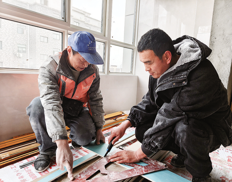 1月4日,袁博(右)和工友在洛南县阳光佳苑小区一个家装工地裁剪吊顶板材。