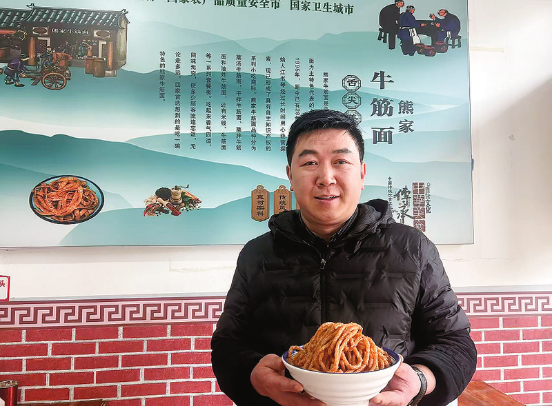 “那时,我在原西街小学当老师,两个娃都在上学,家里特别困难,我媳妇就寻思弄个啥事做。”1月14日,熊家牛筋面的创始人熊景茂回忆,妻子江书琴看到农贸市场上有人用机器压牛筋面当鲜面条卖,就在西街小学附近租了个门面,把牛筋面拌上调料,一份卖个3角5角的,没想到孩子们很爱吃。他们把这当成零食,放学路上用手捏一点放嘴里边走边吃,从那时起,牛筋面便成了一代丹凤人刻在味蕾上的童年记忆。