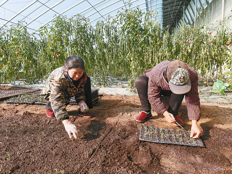 1月22日,务工群众在陕西洛水情源农业科技有限公司种植基地育西红柿苗。据了解,该公司在洛南县城关街道陶岭社区建有53亩水果西红柿日光温室大棚,集育苗、种植、销售于一体,全年共育西红柿苗28万株,每年种植2茬,每天雇佣10多名妇女在基地务工增收。 (本报通讯员 毕波波 摄)