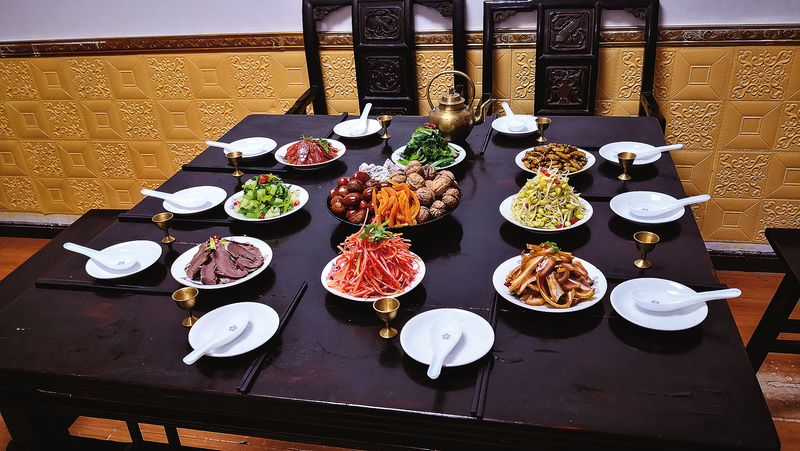 △“古镇宴席三点水”的开席菜以八道凉菜为主,四荤四素环绕着中间的干果盘,形如莲花绽放。