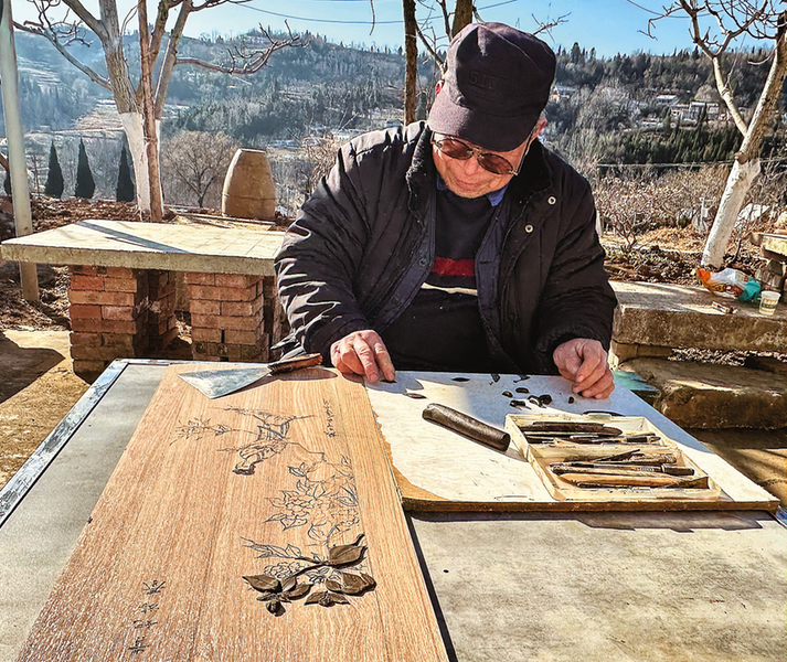 △大漆泥塑工序看似简易,实则对工艺技法要求严苛。图为1月9日,王兴时先在木板上勾勒出草图,再以大漆泥塑进行塑制。1月9日上午,晴空如洗,冬日暖阳温柔地洒落在商州区陈塬街道上河村的一处农家小院里。年近七十的商洛大漆泥塑第四代传承人王兴时铺开小桌椅,拿出备好的大漆泥,继续进行自己之前未完成的作品《杨贵妃游春》的制作。