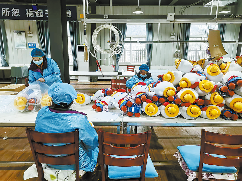 ▷工人们身着防护服,在车间赶制毛绒玩具。