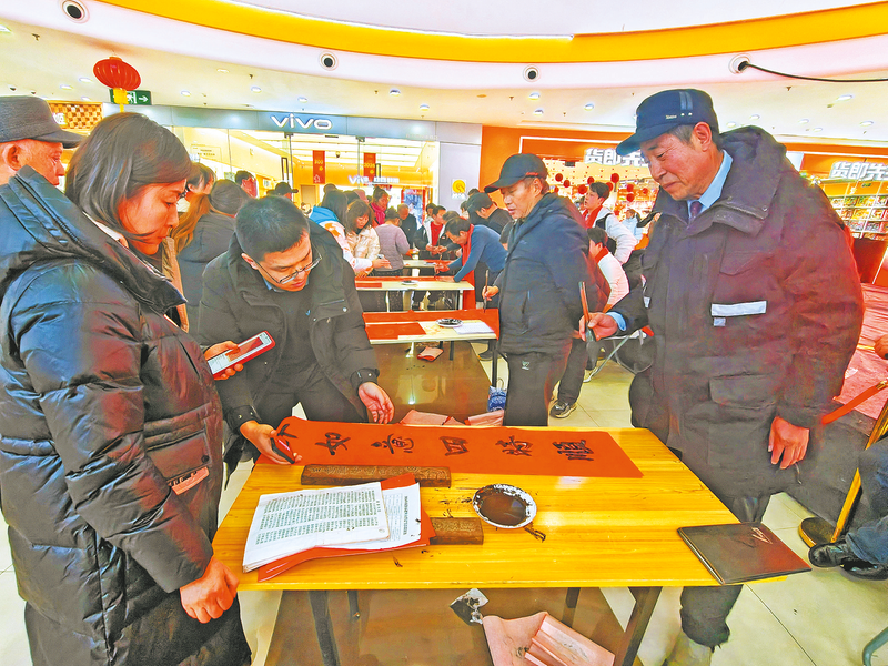 1月28日,商洛市老年大学组织10多名书法艺术家,在市区万达广场内举办义写春联活动。在现场,书法艺术家们挥毫泼墨,为参与活动的市民书写对联300多幅。(本报记者 杨 鑫 摄)