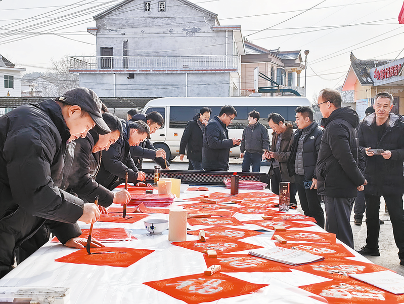 1月28日,民进商洛市委会在洛南县火寨村开展丙午(2026)民进全国“春联万家·策马启新”活动,为当地群众现场书写春联和“福”字,传递新春祝福。 (本报记者 马泽平 摄)