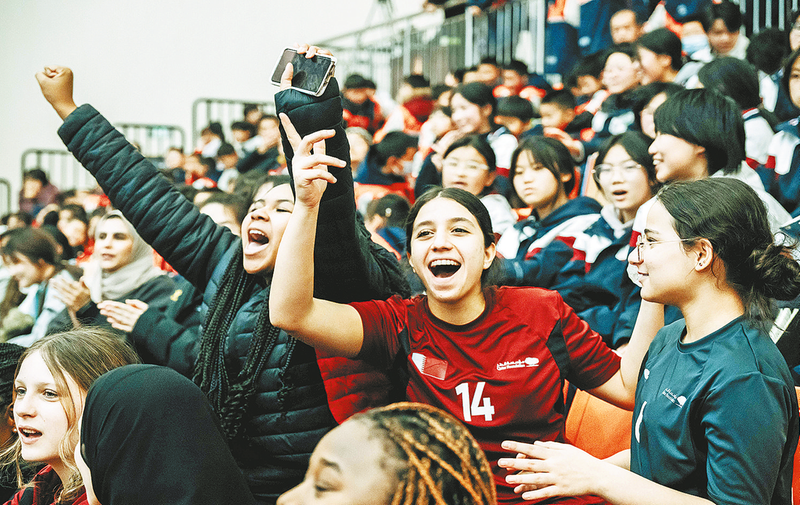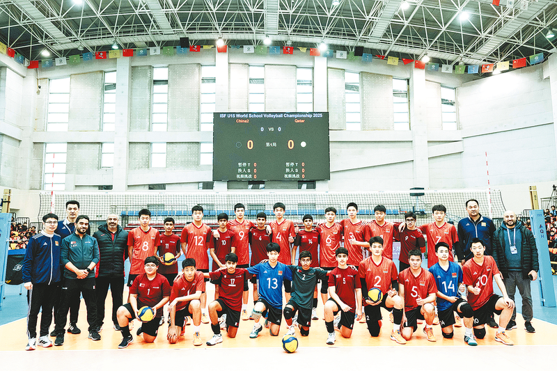 ◁U15世界中学生排球锦标赛参赛选手赛后合影。本报记者 耿 锟