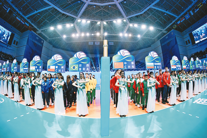U15世界中学生排球锦标赛开幕式上,各国代表队齐聚一堂。