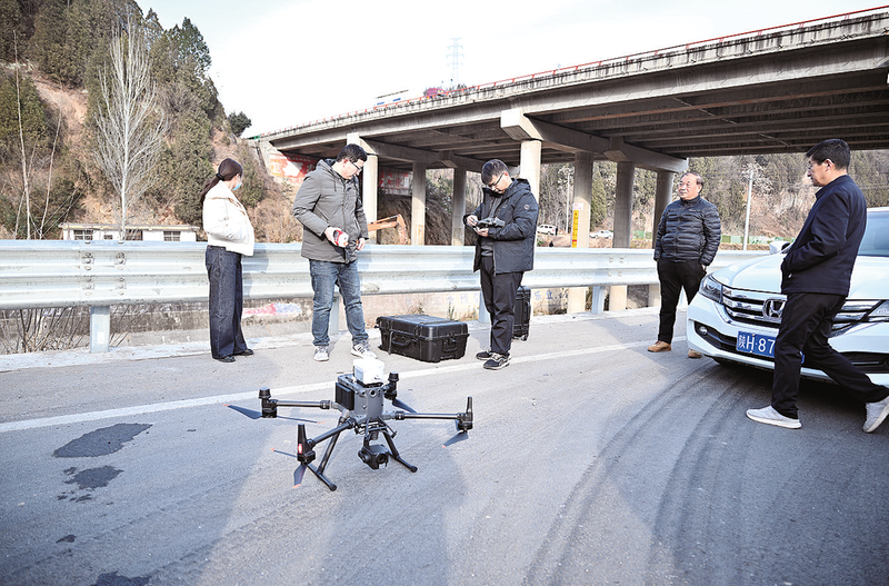 工作人员利用无人机开展环境应急监测。