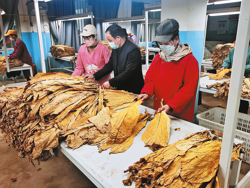 镇安县烟草专卖局(分公司)永乐烟叶工作总站梅花分站副站长张三民(中)指导烟叶分级。
