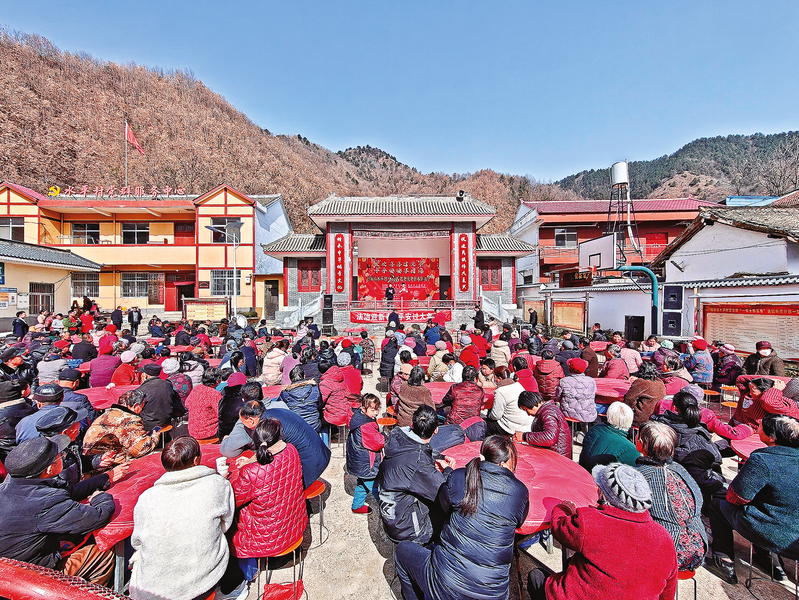 2月10日,商州区杨斜镇水平村举办“欢欢喜喜过大年,平平安安享团圆”敬老爱老新春联欢会。邀请全村300多名60岁以上老人欢聚一堂,共同欣赏精彩文艺演出、品尝传统大烩菜,欢欢喜喜迎春节。(本报记者 杨 鑫 摄)