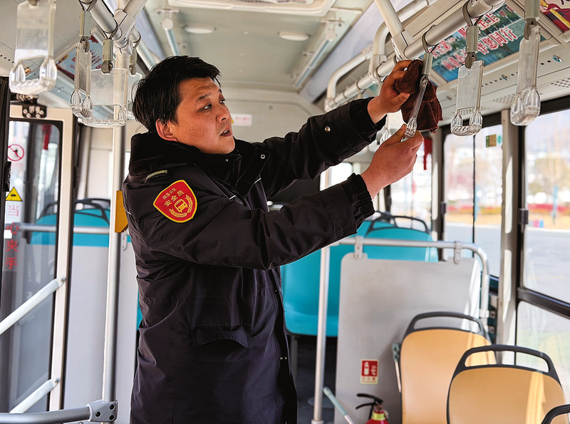 陈佳玉正在打扫车内外卫生2月17日,大年初一早上,在市区11路公交车秦岭博物馆站前,早班车没有其他时间段的拥挤,只有零星几个赶早的行人,脸上带着过年的放松与喜悦。
