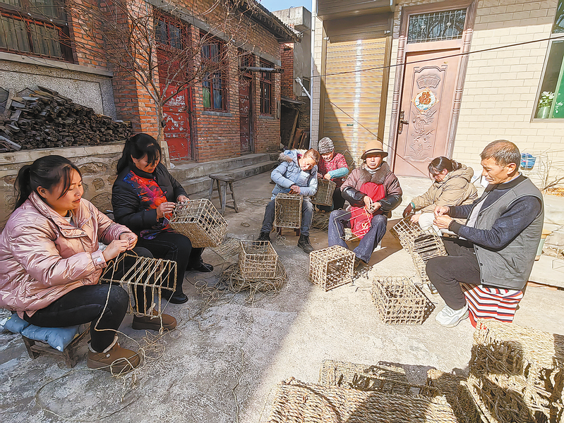 近年来,洛南县多渠道拓宽就业渠道,组织引导农村妇女、大龄劳动力等群体在社区工厂、家庭小作坊和农产品加工点实现灵活、稳定就业。图为近日,群众在洛南县古城镇古城街社区华雅园工艺品加工点制作收纳篮。(本报通讯员 刘卫锋 摄)