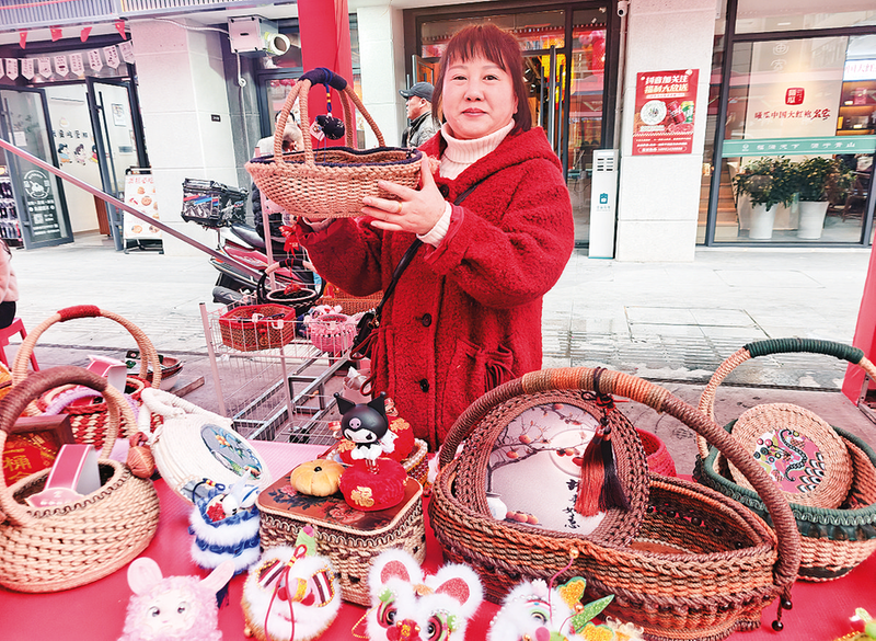 非遗年货集市上,手工艺人展示质朴精巧的传统麻绳编筐。新春佳节,柞水县宏阳路步行街上,熙熙攘攘的人群把这里“挤”得暖意融融。红灯笼一溜儿高高挂起,彩旗在寒风里猎猎作响,街口的大红条幅上,“非遗贺新春·寻味柞水年”几个字格外醒目。循着清脆的锣鼓点和洪亮的吆喝声往里走去,非遗大戏台、年货展台与直播镜头连成一片,热腾腾的年味儿扑面而来。
