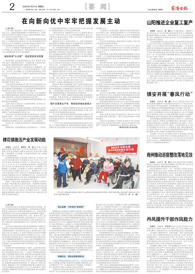 本报讯 (通讯员 孙 婕)近日,山阳县紧扣“一城两区三地”目标定位,以“开年即冲刺、起步即加速”的决心,统筹部署、精准施策,凝聚全县各部门、各镇(街道)合力,全方位推进企业复工复产,统筹抓好生产发展与安全生产,为全年县域经济高质量发展开好局、起好步。