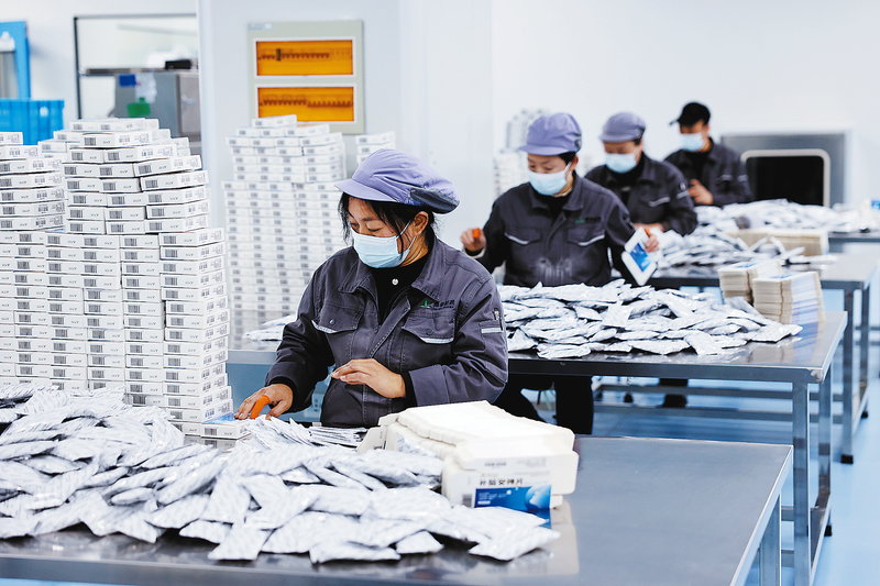 3月2日,在商洛经开区泰华天然生物制药有限公司生产车间,工人正进行药品包装。该企业建有中药前处理及提取、抗肿瘤原料药、天然提取原料药、中成药固体制剂等生产线,产品覆盖肿瘤科、消化科、妇科、皮肤科等领域,2025年实现产值2.25亿元、销售收入2.07亿元、出口额86万美元。 (本报记者 李 敏 摄)