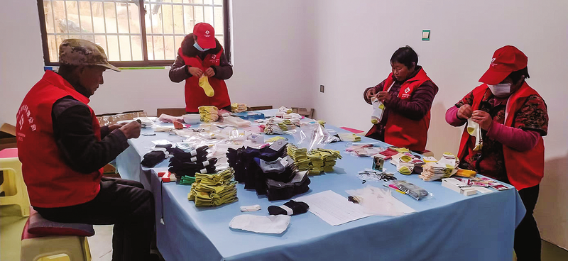 3月6日,工人在商洛兆润针织有限公司生产区对生产的袜子进行手工收口。该公司位于洛南县景村镇景丰村,作为社区工厂,安置困难家庭妇女100多人就业,人均月收入3000多元。(本报记者 贾书章 摄)