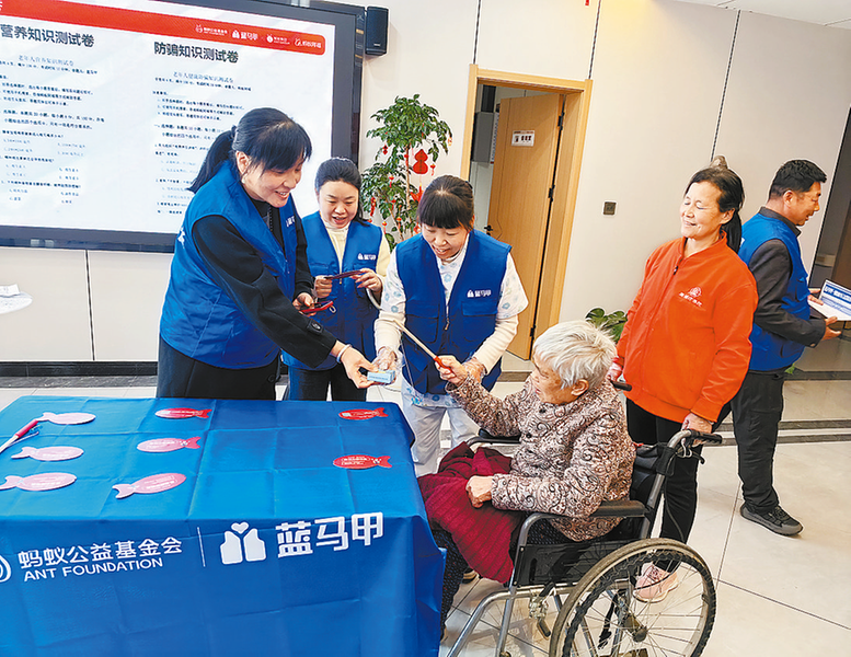 近日,洛南县肢体残疾人协会7名蓝马甲志愿者走进洛南县康源疗养院,开展“健康是福,新春送暖”主题活动,为32名老人送去健康宣讲,并开展系列健康乐活小游戏。 (本报记者 肖 云 摄)