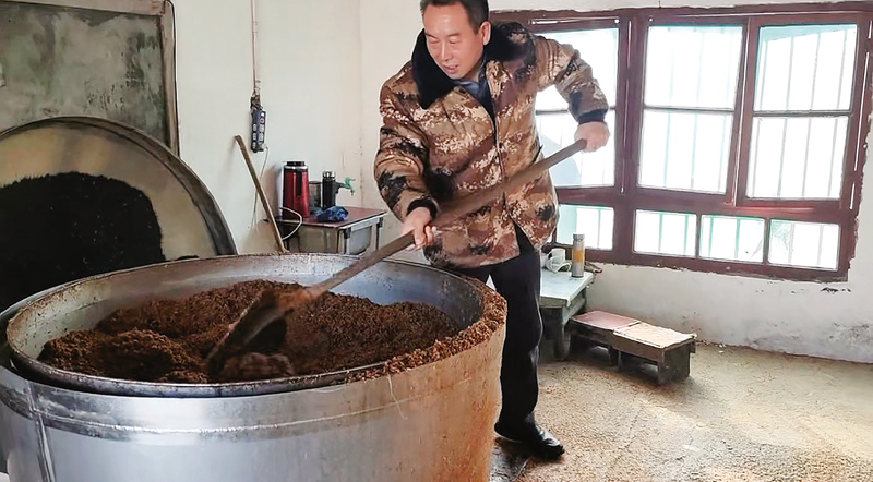 陈永明正在拌酒曲。 初春的微风,拂过巍巍秦岭的层峦叠嶂。在柞水县营盘镇秦丰村,历经沧桑的秦楚古道蜿蜒而过。古道无言,却见证了千百年来商贾的马蹄声声与岁月更迭。如今,在这条古道旁,一座古朴与现代交织的青砖院落里,不时飘出淡淡酒香,惹人沉醉,这便是“秦楚古道陈氏古酿坊”。