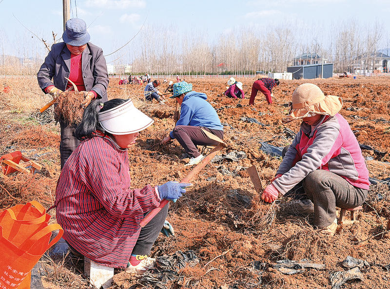 村民抢抓晴好天气采挖丹参。3月春风暖,田间采收忙。近日,走进洛南县古城镇姜村千亩药粮套种基地,昔日紫红茎叶探出地膜的丹参田,如今已化作一片繁忙的丰收图景。近年来,古城镇严守耕地红线,深耕粮食生产与特色产业融合发展,持续深化“粮药套种”模式,推动道地中药材成为乡村振兴的“硬支撑”,真正实现“药田”变“良田”、药材变“药财”。