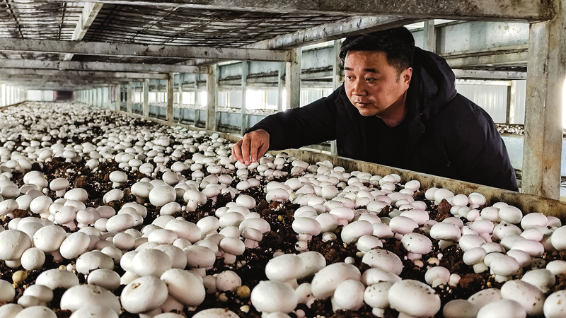 张方在查看双孢菇长势。