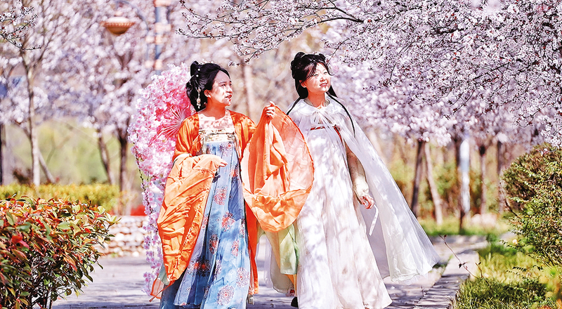 3月10日,山阳县漫川古镇李子花盛开如雪,身着汉服的游客赏花游玩,宛若画中景致。