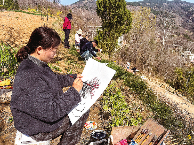 3月21日,由商州区文学艺术界联合会主办的“春来早·迎高铁——康养商州喜迎宾”采风写生活动在城关街道杏树园村举行,20多名文艺工作者,以笔墨丹青描绘春日盛景,定格乡村新貌。 (本报记者 王孝竹 摄)
