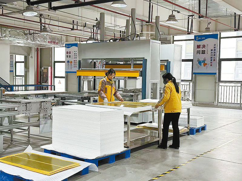 在陕西砺冰拉米拉热能技术有限公司生产车间内,工人正在有条不紊地进行金乌板与环氧板铺膜作业。本报讯 (记者 黄朝梅)3月20日,在位于山阳高新区的陕西砺冰拉米拉热能技术有限公司生产车间内,工人正有条不紊地进行金乌板与环氧板铺膜作业,经热压机压合固化完成板材成型,生产流程高效推进。
